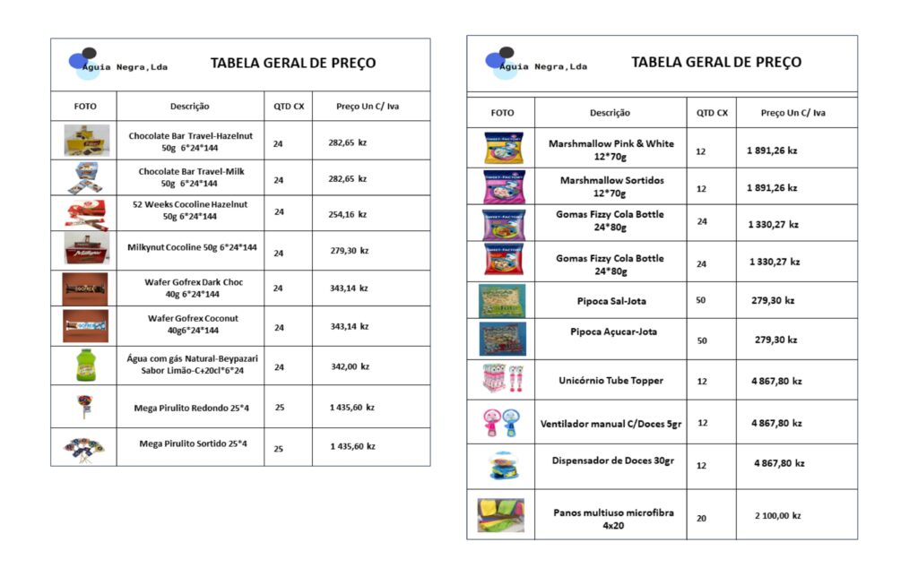 Águia Negra, Lda empresa de direito angolano sedeada em Luanda, rua direita do Patriota. Importadores, exportadores e distribuidores de produtos diversos importados na República da Turquia, desde alimentos (Bolachas wafers recheadas, Chocolates, Gomas e Guloseimas), têxteis e outros.